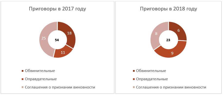 По результатам судебного рассмотрения уголовных производств количество подтвержденных уклонений от уплаты налогов еще меньше. Так, по данным Единого государственного реестра судебных решений, всего за 2018 год было принято 23 приговора, а именно: 14 обвинительных приговоров, из которых 8 на основании соглашений о признании виновности, и 9 оправдательных приговоров. Такое количество как в целом, так и по каждой конкретной категории, является на 57,4 % меньше, чем в 2017 году, что наглядно прослеживается на графиках ниже: