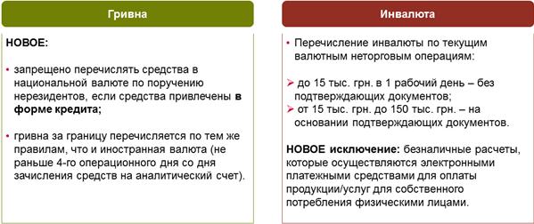 - запрет покупки иностранной валюты/ перечисления средств в гривнах для проведения расчетов за импорт продукции, если (1) таможенное оформление операции было проведено до 1 января 2014 года включительно и (2) по договору произошла замена должника и/ или кредитора в обязательстве (сохранилось исключение для импортных операций приобретения жизненно необходимых товаров: природного газа, электроэнергии, медицинских изделий для лечения онкологических больных и т.п.);