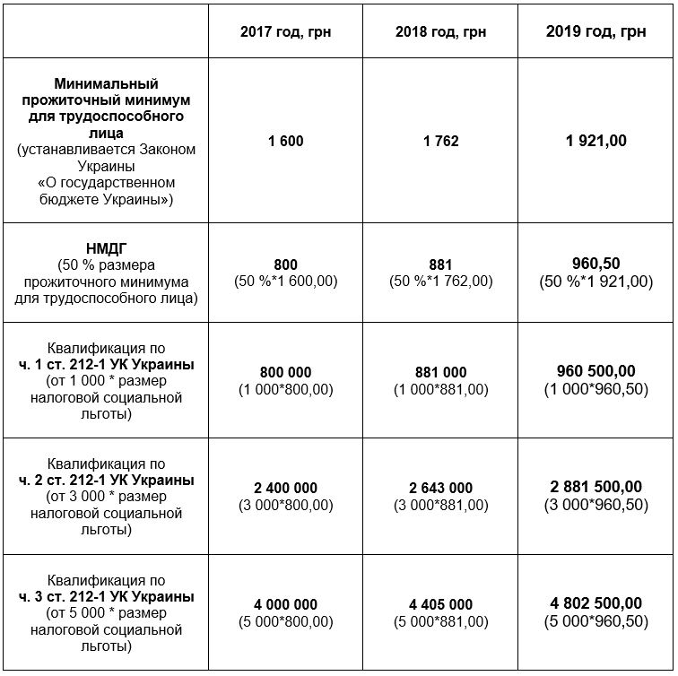 К слову, аналогичные пороги установлены и для квалификации умышленного уклонения от уплаты налогов (ст. 212 УК Украины) (подробнее об этом читайте в нашем обзорном письме «Пороги для привлечения к уголовной ответственности по ст. 212 УК Украины в 2019 году»).