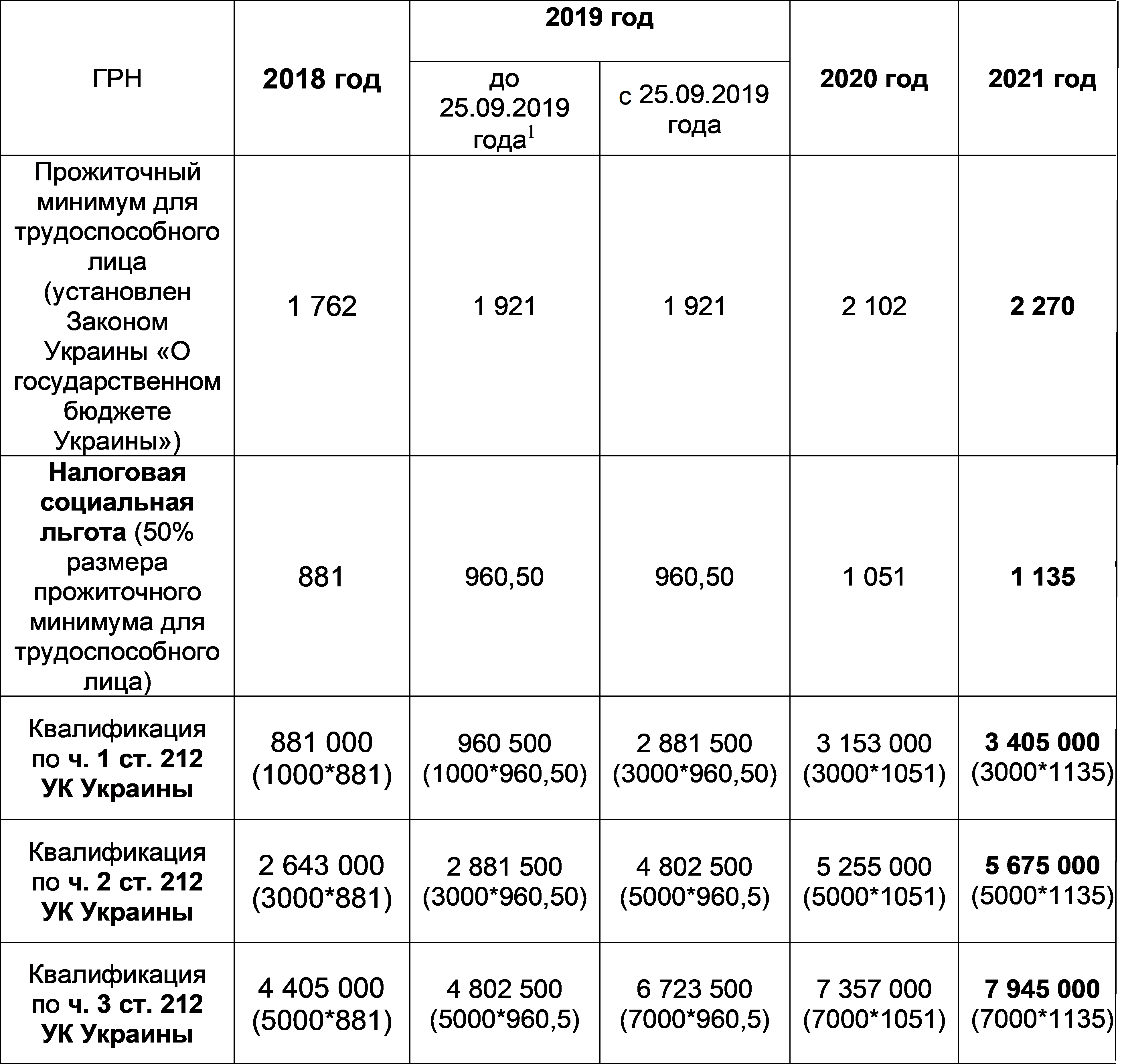 Таким образом, квалификация ответственности по ст. 212 УК Украины в 2021 году будет осуществляться по следующим пороговым показателям (для удобства, предоставляется по сравнению с порогами в предыдущие годы):
